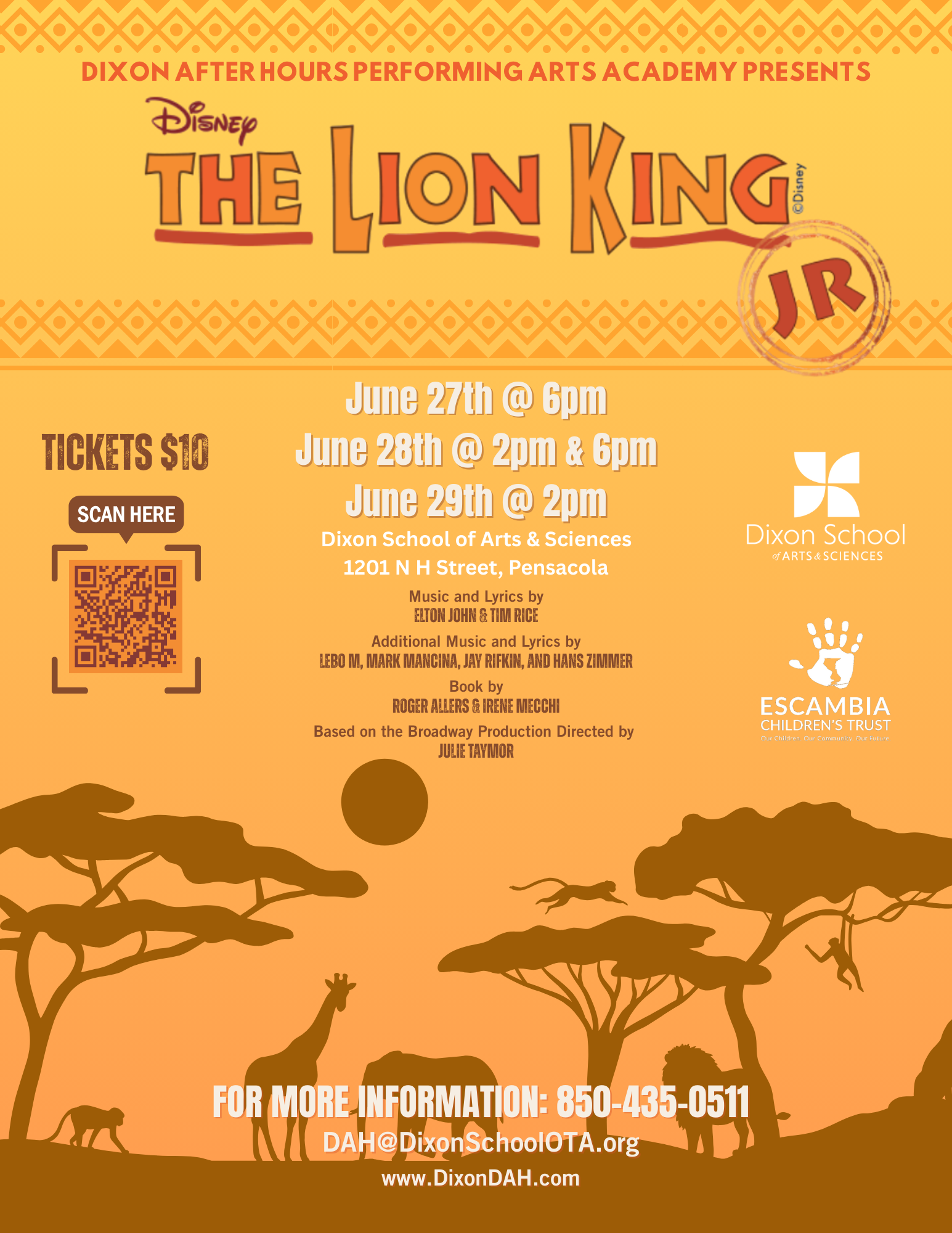 Dixon After Hours (DAH) is an after-school performing arts program that offers dance, vocal, and acting training along with a chance to participate in a Broadway style production in the spring, summer and fall of each school year. Our program is open to students ages 6-14 living in Escambia County, Florida. Our summer program welcomes students ages 6-9 for half days and ages 10-18 for a full day performing arts camp.